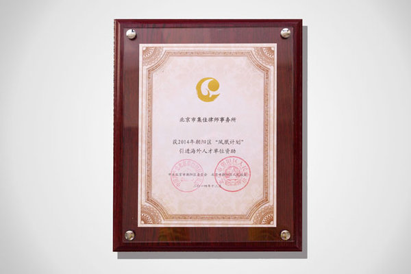 近日,在2014年朝阳区“凤凰计划”认定仪式上,北京市集佳律师事务所荣获2014年朝阳区“凤凰计划”引进海外人才单位资助。这意味着,集佳在积极吸引海外优秀人才方面的工作,得到了朝阳区委和区政府的认可和鼓励。