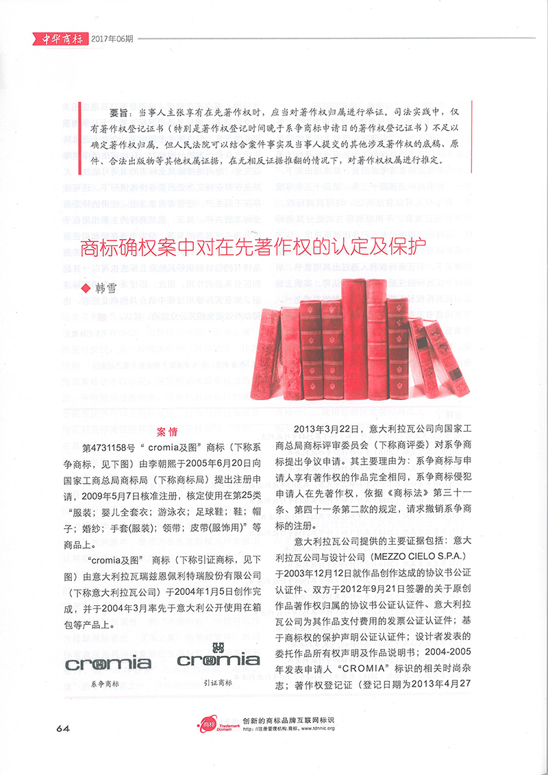 集佳文章《商标确权案中对在先著作权的认定及保护》在《中华商标》发表