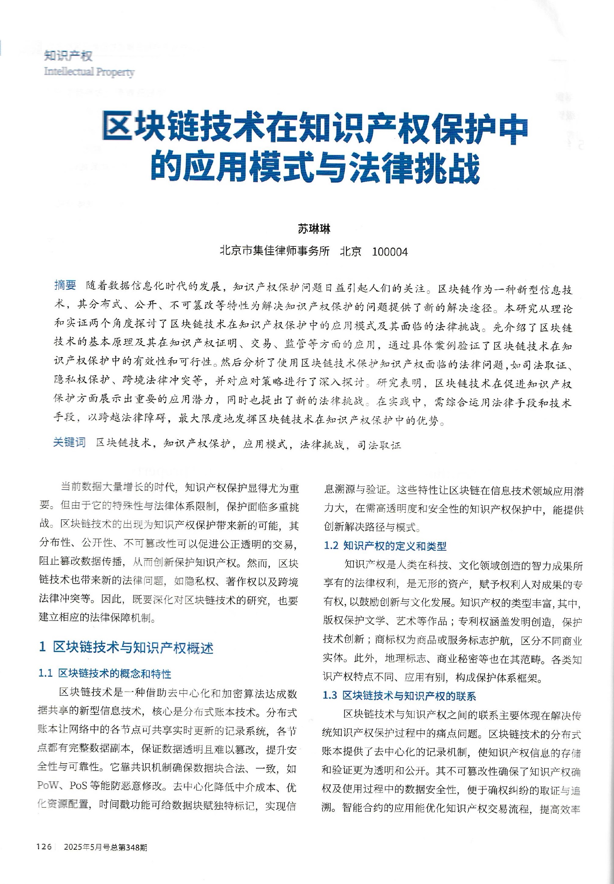 集佳文章《区块链技术在知识产权保护中的应用模式与法律挑战》在《高科技与产业化》发表