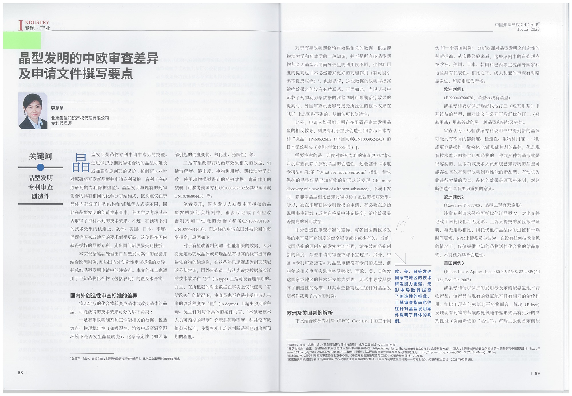 集佳文章《晶型发明的中欧审查差异及申请文件撰写要点》在《中国知识产权》发表