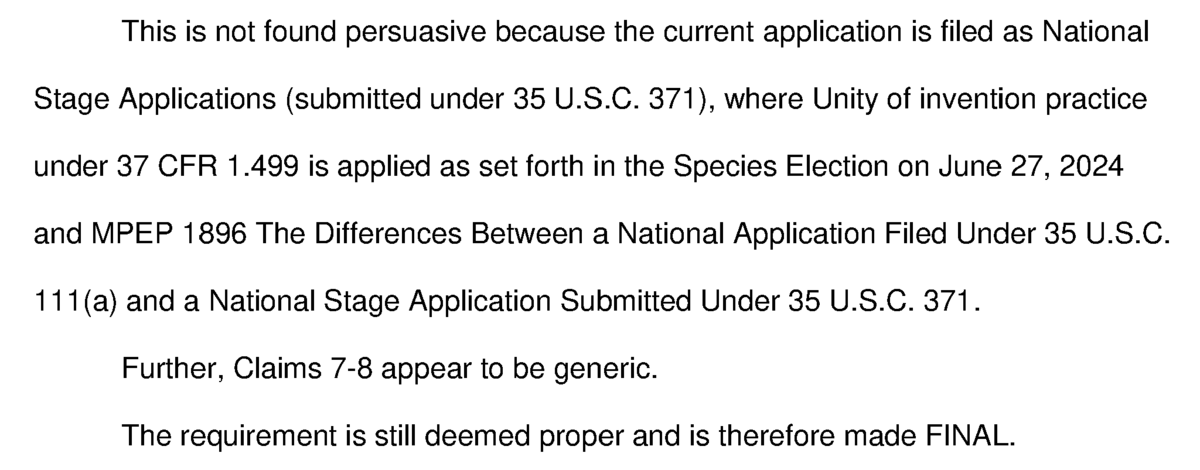 MPEP § 803 规定“If the search and examination of all the claims in an application can be made without serious burden, the examiner must examine them on the merits, even though they include claims to independent or distinct inventions”,即,如果可以在没有严重负担的情况下对申请中的所有权利要求进行检索和审查,则审查员必须根据案情对其进行审查,即使它们包括独立或不同发明的权利要求。如果申请人对RR的回复是带有争辩的(with traverse),该争辩可以保留未来对RR进行申诉的权利,且审查员需要对该争辩做出回应。这样的回应可能是审查员同意撤回RR,然而,更可能的是审查员发出Final RR,维持前次的RR意见,审查员通常在Final RR中仅对RR的理由稍作调整。