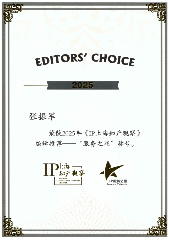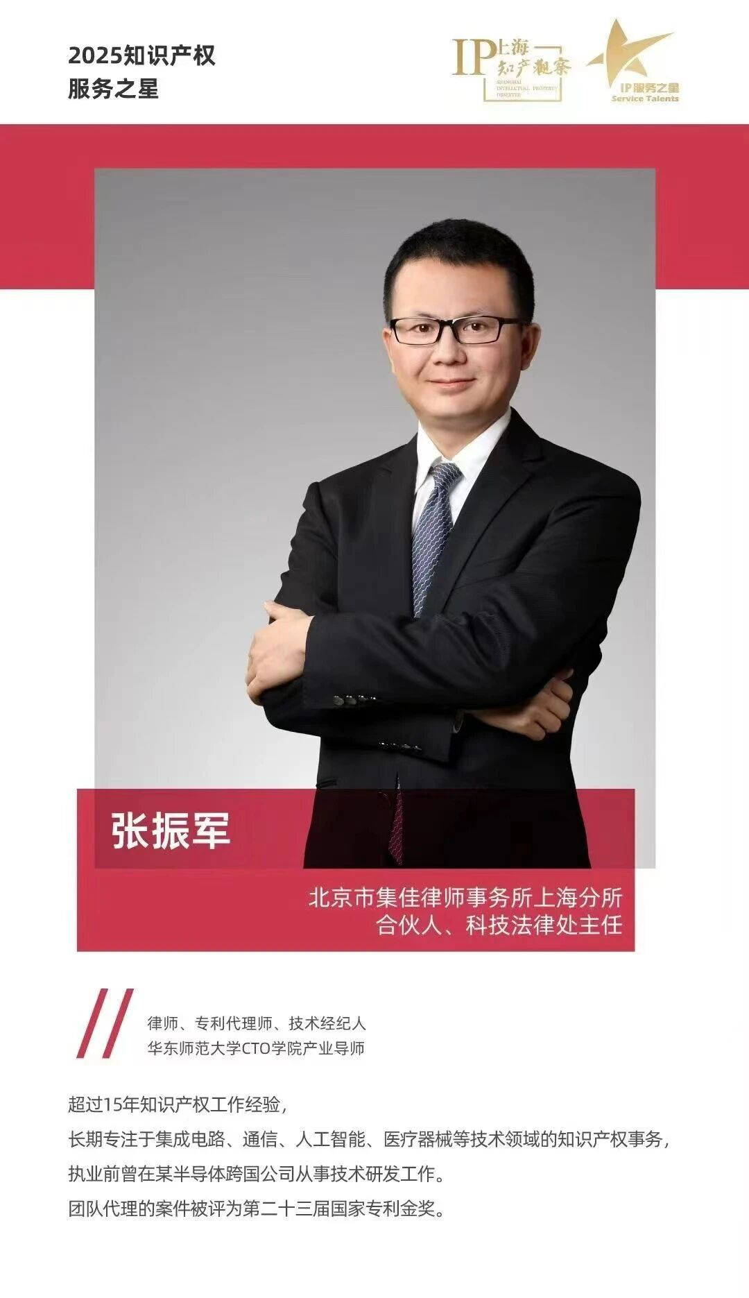 集佳上海分所张振军律师凭借卓越的服务能力与良好的客户口碑获评“2025知识产权服务之星”。