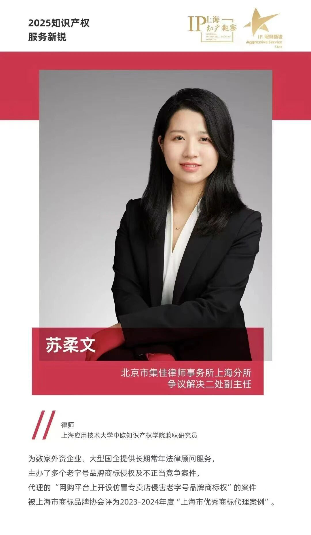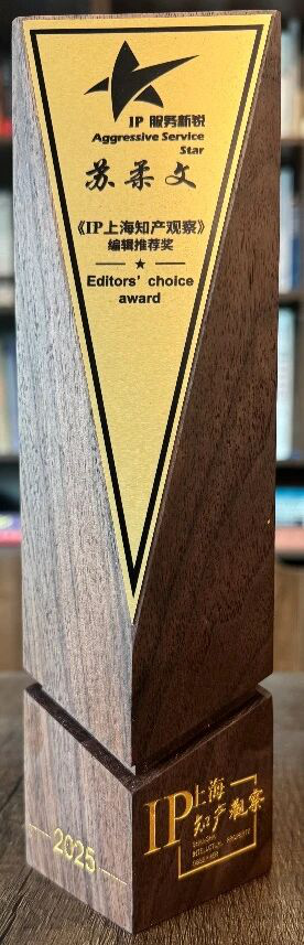 集佳上海分所苏柔文律师凭借优秀的专业素养与突出的业务表现获评“2025知识产权服务新锐”。